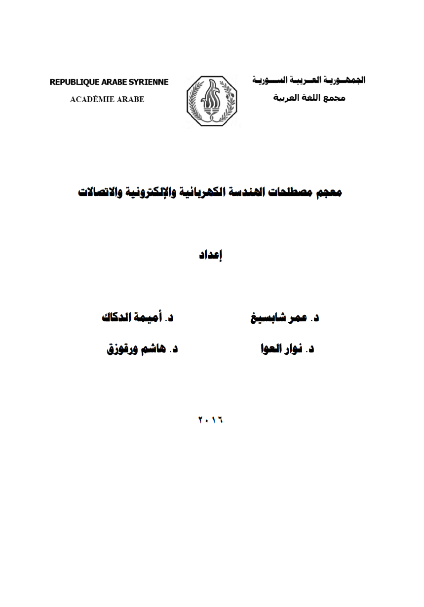 | معجم مصطلحات الهندسة الكهربائية والإلكترونية والاتصالات | د. عمر شابسيغ و د. أميمة دكاك و د.نوار العوا و د. هاشم ورقوزق | معجم المصطلحات المعتمد في المعهد العالي للعلوم التطبيقية والتكنولوجيا وجمّعه وأعده ثلة من الدكاترة من المعهد. يحوي مجموعة متنوعة من المصطلحات في مجال الكهرباء والإلكترون والاتصالات. لا يكتفي بذكر المصطلح وترجمته وإنما أيضاً شرح عن المصطلح بحد ذاته |