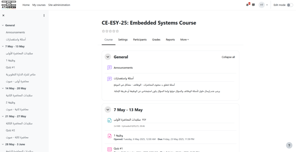 تم تدريس مقرر النظم المضمّنة في كلية الهندسة الميكانيكية والكهربائية في الفصل الدراسي الثاني من العام الدراسي 2024 – 2025 وكان لطلاب السنة الرابعة في قسم هندسة الحواسيب والأتمتة والشكر للمهندس المدرس حسن نوفل لدعوتي للمقرر. كانت تجربة مهمّة لي كونها مع طلاب القسم الذي تخرجت منه منذ حوالي 11 عام وعدت إليه للتدريس بعد أكثر من عشر سنوات خبرة كلها قضيتها في اختصاص هذه المادة “النظم المضمّنة”.